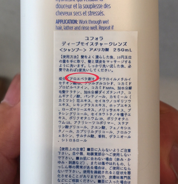 ちなみに、アロエベラ液汁、界面活性剤以外には植物由来のエキスや髪の主成分のケラチンを補充するものなどが含まれていて、香り付けには花のエッセンシャルオイルがブレンドされています。